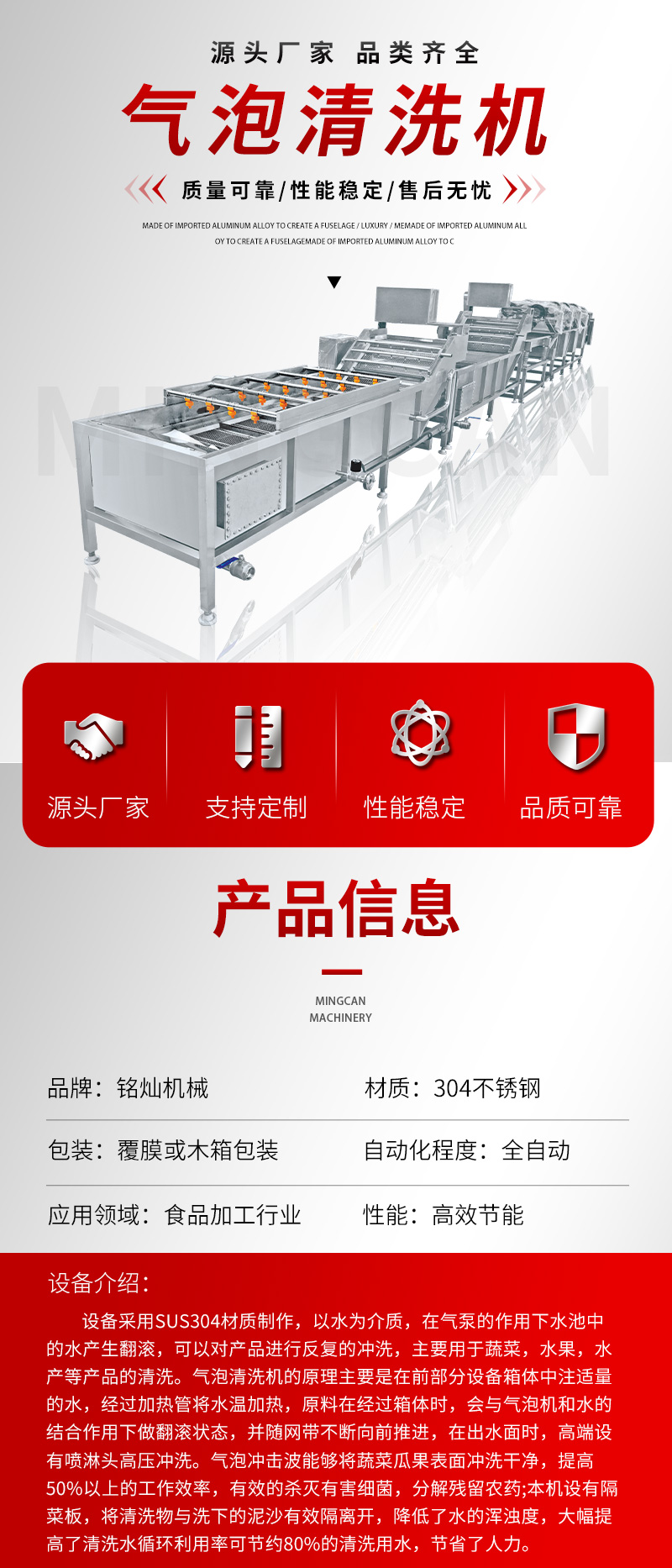 设备采用SUS304材质制作,以水为介质,在气泵的作用下水池中的水产生翻滚,可以对产品进行反复的冲洗,主要用于蔬菜,水果,水产等产品的清洗。气泡清洗机的原理主要是在前部分设备箱体中注适量的水,经过加热管将水温加热,原料在经过箱体时,会与气泡机和水的结合作用下做翻滚状态,并随网带不断向前推进,在出水面时,设有喷淋头高压冲洗。气泡冲击波能够将蔬菜瓜果表面冲洗干净,提高50%以上的工作效率,有效的杀灭有害细菌,分解残留农药;本机设有隔菜板,将清洗物与洗下的泥沙有效隔离开,降低了水的浑浊度,大幅提高了清洗水循环利用率可节约80%的清洗用水,节省了人力。
